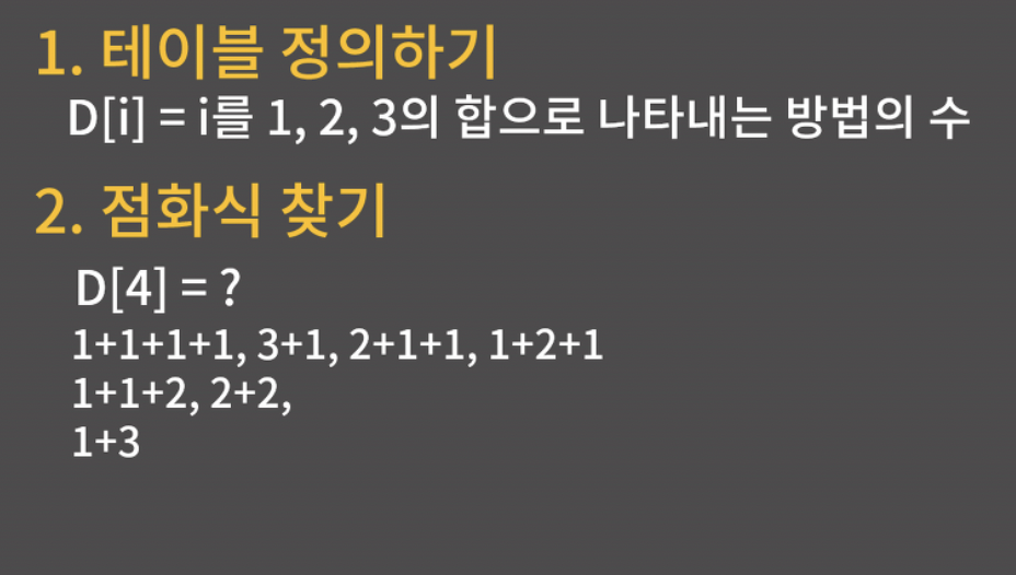 테이블은 D[4] = 7 의 형태로 만들면 된다. D[i] = i를 1,2,3의 합으로 나타내는 방법의 수.
